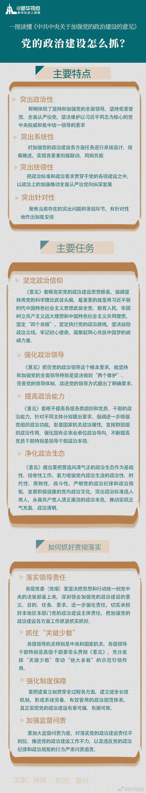 黨的政治建設(shè)是黨的根本性建設(shè),決定黨的建設(shè)方向和效果。新華社27日受權(quán)發(fā)布《中共中央關(guān)于加強(qiáng)黨的政治建設(shè)的意見(jiàn)》。意見(jiàn)有什么特點(diǎn)?加強(qiáng)黨的政治建設(shè)有哪些主要任務(wù)?如何抓好落實(shí)?戳圖了解↓ ????