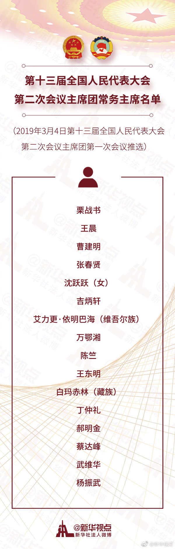 栗戰(zhàn)書 王晨 曹建明 張春賢 沈躍躍(女) 吉炳軒 艾力更·依明巴海(維吾爾族) 萬鄂湘 陳竺 王東明 白瑪赤林(藏族) 丁仲禮 郝明金 蔡達峰 武維華 楊振武