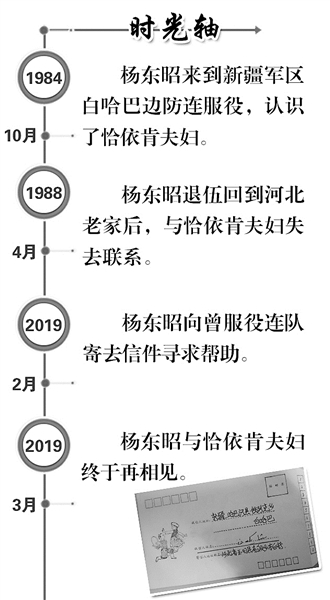 隨著時間的推移,楊東昭這個當年20歲的小伙子如今已年過半百,雖然日子過得越來越紅火,但內心對兩位哈薩克族老人的思念越發(fā)強烈。在千家萬戶團聚歡樂的鞭炮聲中,他提筆寫了一封信寄到曾經(jīng)服役的連隊尋求幫助。