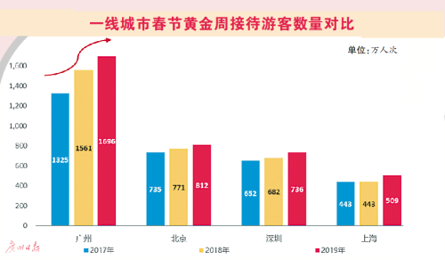 2019年春節(jié),廣州創(chuàng)下游客接待量和旅游業(yè)總收入“雙新高”,共接待旅客1696.27萬人次,較2018年同期增長8.66%,高于北京的811.70萬人次、上海的509.20萬人次,居一線城市首位,分別是北京的兩倍和上海的三倍;旅游業(yè)創(chuàng)收122億元,實現(xiàn)9.74%的增長,高于北京的81.85億元和上海的66.20億元,分別是北京的1.5倍和上海的1.8倍。