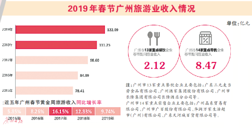自2015年以來,廣州春節(jié)黃金周旅游總收入逐年攀升。2018年突破百億大關,今年再創(chuàng)新高。大批旅客的到來帶動廣州與旅游相關的餐飲、零售等行業(yè)的持續(xù)旺盛。