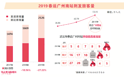 2019年春運期間(1月21日至3月1日),廣州南站到發(fā)旅客2126.37萬人次,日均旅客到發(fā)量53萬人次,同比增長24.23%,居全國第一。另外,今年廣州到達旅客量達1050.75萬人次,較上年同期增長27.22%,創(chuàng)近三年來最大增幅,春運期間來廣州的旅客數(shù)不斷攀升。廣州南站客流峰值出現(xiàn)在2月10日(年初六),到發(fā)客流量達67.14萬人次,較去年春運峰值(55.72萬人次)上升20.49%。