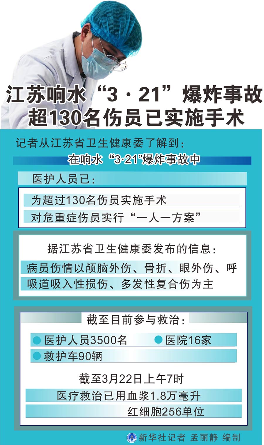 圖表:江蘇響水“3·21”爆炸事故超130名傷員已實(shí)施手術(shù) 新華社記者 孟麗靜 編制