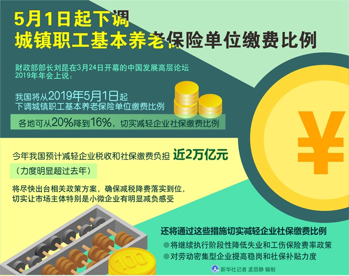 新華社北京3月24日電(記者韓潔、馬卓言)財(cái)政部部長(zhǎng)劉昆在24日開(kāi)幕的中國(guó)發(fā)展高層論壇2019年年會(huì)上說(shuō),我國(guó)將從2019年5月1日起下調(diào)城鎮(zhèn)職工基本養(yǎng)老保險(xiǎn)單位繳費(fèi)比例,各地可從20%降到16%,切實(shí)減輕企業(yè)社保繳費(fèi)比例。