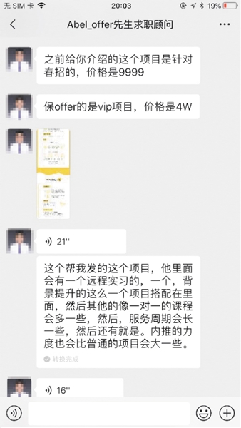 記者以春招求職學(xué)生身份與該助手取得了聯(lián)系,在詢問過記者的畢業(yè)學(xué)校、學(xué)習(xí)專業(yè)、求職意向后,這位助手推薦了一個(gè)針對2019年春招的項(xiàng)目,該項(xiàng)目顯示服務(wù)周期三個(gè)月,包含了10個(gè)導(dǎo)師輔導(dǎo)課程及在線求職精品課,與海量求職資料包、求職信息,以及團(tuán)隊(duì)中“1v1貼心陪伴”。而這項(xiàng)春招項(xiàng)目的標(biāo)價(jià),高達(dá)8999至12999元。
