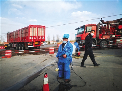 陜西省榆林市靖邊縣發(fā)生非洲豬瘟疫情后,3月9日,靖邊張家畔一公路交叉口,工作人員在交警配合下,對(duì)過(guò)往車輛噴灑消毒液。 圖/視覺(jué)中國(guó)