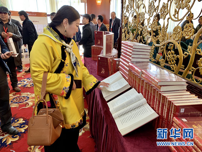 與會嘉賓在發(fā)布儀式現(xiàn)場翻閱《格薩爾文庫》。新華網(wǎng) 王頔 攝