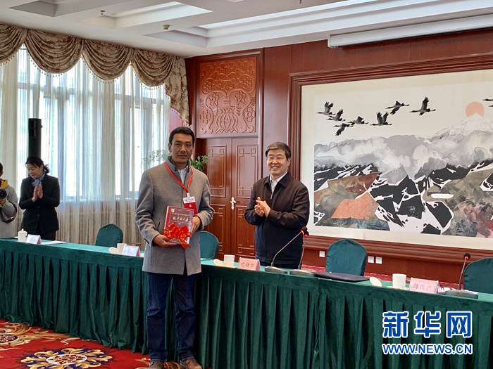 全國政協(xié)副主席、國家民委主任巴特爾(右一)向相關單位贈書。新華網(wǎng) 王頔 攝