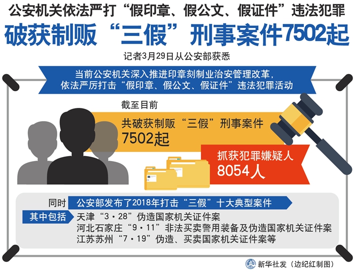 新華社北京3月29日電(記者丁小溪)記者29日從公安部獲悉,當(dāng)前公安機(jī)關(guān)深入推進(jìn)印章刻制業(yè)治安管理改革,依法嚴(yán)厲打擊“假印章、假公文、假證件”違法犯罪活動,截至目前,共破獲制販“三假”刑事案件7502起,抓獲犯罪嫌疑人8054人。