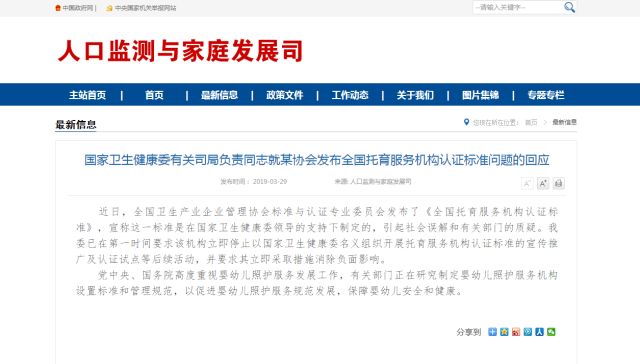 近日,全國(guó)衛(wèi)生產(chǎn)業(yè)企業(yè)管理協(xié)會(huì)標(biāo)準(zhǔn)與認(rèn)證專業(yè)委員會(huì)發(fā)布了《全國(guó)托育服務(wù)機(jī)構(gòu)認(rèn)證標(biāo)準(zhǔn)》,宣稱這一標(biāo)準(zhǔn)是在國(guó)家衛(wèi)生健康委領(lǐng)導(dǎo)的支持下制定的,引起社會(huì)誤解和有關(guān)部門的質(zhì)疑。我委已在第一時(shí)間要求該機(jī)構(gòu)立即停止以國(guó)家衛(wèi)生健康委名義組織開(kāi)展托育服務(wù)機(jī)構(gòu)認(rèn)證標(biāo)準(zhǔn)的宣傳推廣及認(rèn)證試點(diǎn)等后續(xù)活動(dòng),并要求其立即采取措施消除負(fù)面影響。