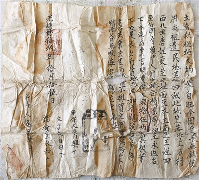 墓主人有可能姓朱。寶頂西北,是王鳳榮家的宅院。王女士收拾屋子時(shí),曾發(fā)現(xiàn)一張百年前的《土地買賣文書》。這張宣紙文書有A3紙大小,綿軟泛黃,滿是褶皺。王鳳榮將其小心翼翼地?cái)傇诓鑾咨?,呈現(xiàn)出一篇并不算美觀的毛筆字,其大意為:賣主名叫朱自旺,因手頭缺錢,將祖遺民地一處四畝,賣予王永旺名下,賣價(jià)文銀十五兩,立字為證,光緒二十三年(1897年)。文書上還有三處紅章,但字跡已是漫漶不清。
