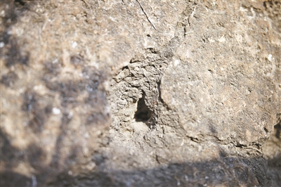 寶頂?shù)娜贤帘砻?,疑為盜墓人用鐵釬打下的探孔
