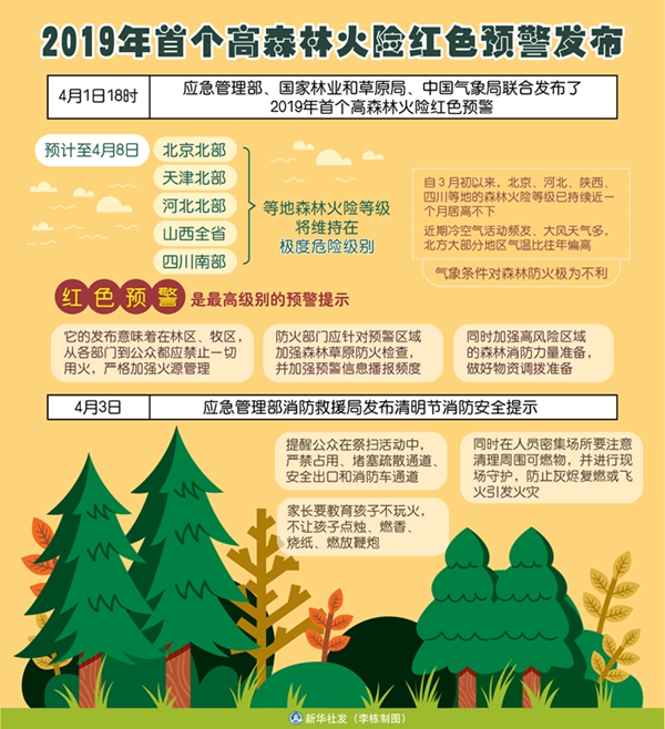 “此次紅色預(yù)警是三部門綜合考慮氣象條件、林區(qū)物候及衛(wèi)星林火監(jiān)測(cè)、清明節(jié)期間祭掃影響等情況,經(jīng)過(guò)會(huì)商研判共同發(fā)布的?!敝袊?guó)氣象局公共氣象服務(wù)中心副首席楊曉丹說(shuō),自3月初以來(lái),北京、河北、陜西、四川等地的森林火險(xiǎn)等級(jí)一直居高不下,已持續(xù)近一個(gè)月;近期冷空氣活動(dòng)頻發(fā)、大風(fēng)天氣多,北方大部分地區(qū)氣溫比往年偏高,氣象條件對(duì)森林防火極為不利。