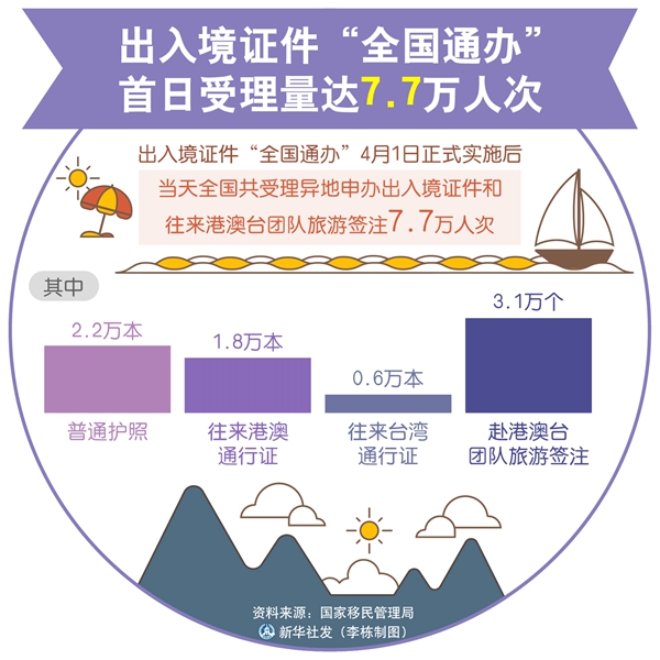 新華社北京4月2日電 記者2日從國家移民管理局獲悉,出入境證件“全國通辦”1日正式實(shí)施后,當(dāng)天全國共受理異地申辦出入境證件和往來港澳臺(tái)團(tuán)隊(duì)旅游簽注7.7萬人次,其中普通護(hù)照2.2萬本、往來港澳通行證1.8萬本、往來臺(tái)灣通行證0.6萬本、赴港澳臺(tái)團(tuán)隊(duì)旅游簽注3.1萬個(gè)。