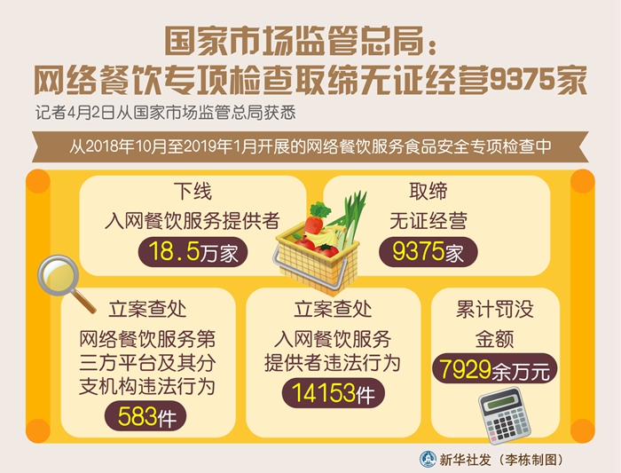 新華社北京4月2日電(記者趙文君)記者2日從國家市場監(jiān)管總局獲悉,在近期開展的網(wǎng)絡(luò)餐飲服務(wù)食品安全專項(xiàng)檢查中,下線入網(wǎng)餐飲服務(wù)提供者18.5萬家,取締無證經(jīng)營9375家。
