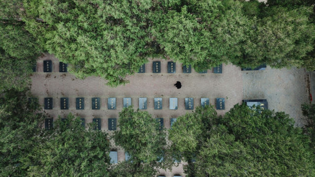 3月21日,張景憲走在張和莊烈士陵園內(nèi)(無人機拍攝)。