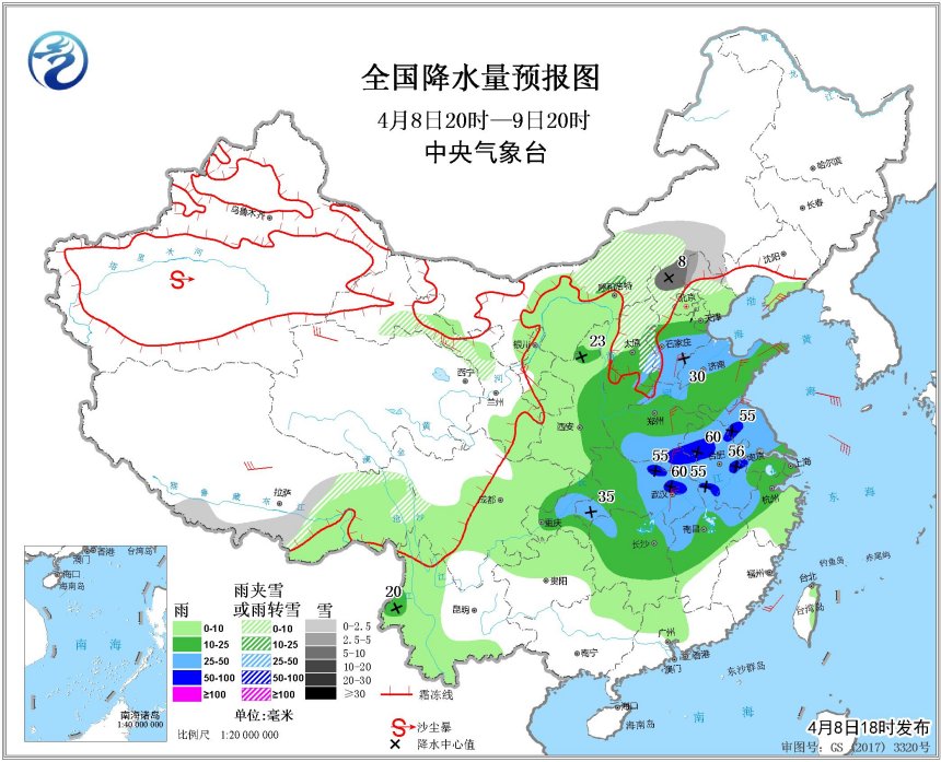 張濤:降水的主要影響時(shí)間為8日夜間到9日白天。北方地區(qū)以大范圍小到中雨的穩(wěn)定性降水為主,無雷電,影響區(qū)域主要集中在西北地區(qū)東部、內(nèi)蒙古中部、華北、黃淮等地。河北南部、河南北部、山東西部等地會(huì)達(dá)到大雨量級。除此之外,北方部分地區(qū)降水會(huì)經(jīng)過雨轉(zhuǎn)雨夾雪或雪的過程,轉(zhuǎn)化主要位置在山西北部、河南北部、北京北部等,內(nèi)蒙古中部局部地區(qū)會(huì)出現(xiàn)大雪天氣。南方的降水量相對較大,以中到大雨為主,部分地區(qū)有暴雨,江漢、黃淮南部、江淮、江南等區(qū)域會(huì)伴有雷電。河南南部和西部、安徽中北部、江蘇中北部和南部、湖北北部和南部、湖南西部等地的部分地區(qū)將有短時(shí)強(qiáng)降水天氣;河南南部、安徽中北部、湖北北部和東部等地的局地將有雷暴大風(fēng)或冰雹天氣。