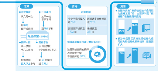 然而,要充分發(fā)揮教育信息化的優(yōu)勢,還需實現(xiàn)信息化手段從“用起來”到“用得好”轉(zhuǎn)變。這就需要依靠培訓(xùn),使教育管理部門和一線師生的信息化素養(yǎng)同步提升。 湖南多地實行四級培訓(xùn)制度:通過“國培計劃”等,培訓(xùn)中小學(xué)校長及教育主管部門人員;通過湖南省中小學(xué)教師信息技術(shù)應(yīng)用能力提升工程,培訓(xùn)信息技術(shù)骨干教師和專任骨干教師;通過組織電化教育館及高校等單位的專家學(xué)者赴基層,培訓(xùn)教育信息化基礎(chǔ)教師;培育出來的“種子教師”,為所在學(xué)校的科任教師普及教育信息化知識。