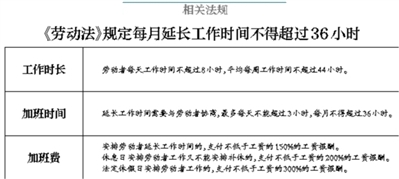 中國財政科學(xué)研究院應(yīng)用經(jīng)濟學(xué)博士后盤和林對北青報記者表示,按照勞動法相關(guān)規(guī)定,在保障勞動者身體健康的條件下,延長工作時間每日不得超過3小時,每月不得超過36小時。在員工存在超時加班的情況下,即使是員工樂意自愿的,企業(yè)仍然會存在一定的用工風(fēng)險,包括勞動監(jiān)察檢查的風(fēng)險、被通報批評和被罰款的風(fēng)險、被舉報的風(fēng)險及仲裁和訴訟的風(fēng)險。本組文/本報記者 溫婧 圖片源自網(wǎng)絡(luò)