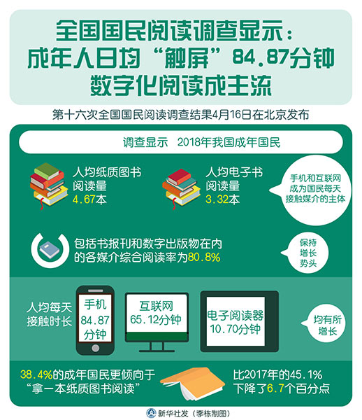新華社北京4月16日電(記者 史競(jìng)男)第十六次全國(guó)國(guó)民閱讀調(diào)查結(jié)果16日在京發(fā)布。調(diào)查顯示,2018年我國(guó)成年國(guó)民人均紙質(zhì)圖書閱讀量為4.67本、電子書閱讀量為3.32本,手機(jī)和互聯(lián)網(wǎng)成為國(guó)民每天接觸媒介的主體,紙質(zhì)書報(bào)刊的閱讀時(shí)長(zhǎng)均有所減少。