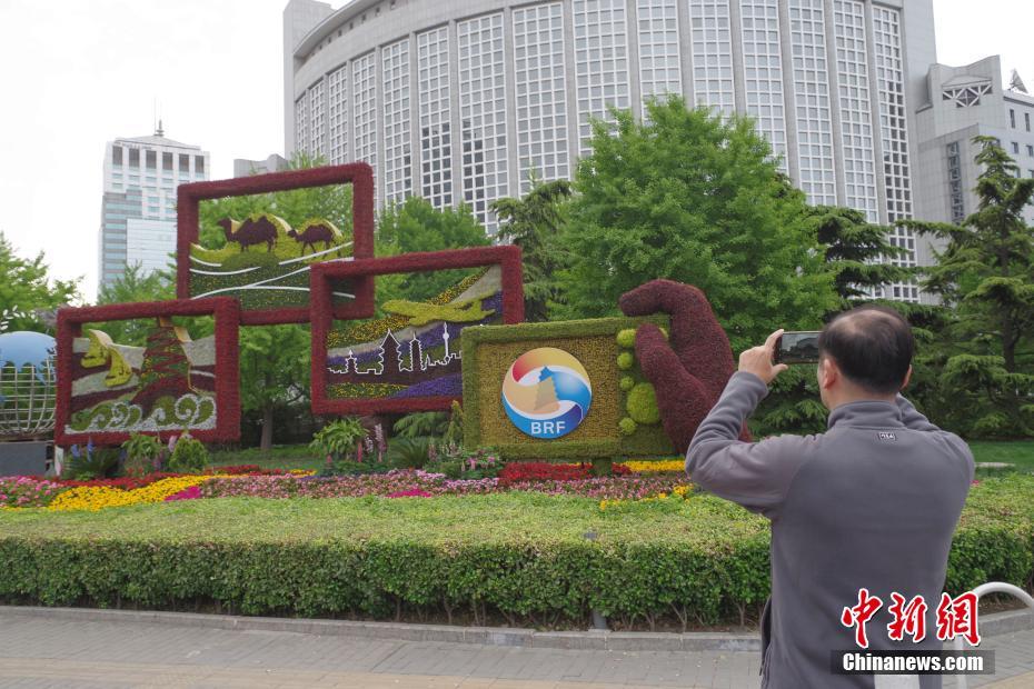 4月18日,北京朝陽(yáng)門(mén)的“一帶一路”主題花壇吸引市民拍照。第二屆“一帶一路”國(guó)際合作高峰論壇即將在北京舉行,北京市內(nèi)布置了多個(gè)主題花壇迎接盛會(huì)。中新社記者 賈天勇 攝
