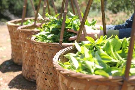 福建武夷山巖茶青葉裝筐集中。