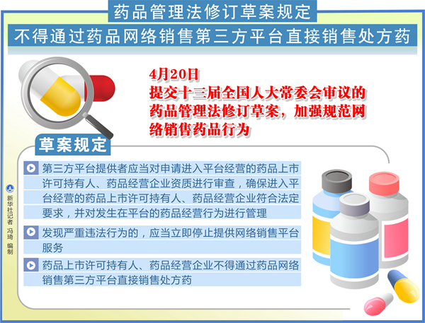 新華社北京4月20日電(記者趙文君)20日提交十三屆全國人大常委會審議的藥品管理法修訂草案,加強規(guī)范網(wǎng)絡(luò)銷售藥品行為,明確不得通過藥品網(wǎng)絡(luò)銷售第三方平臺直接銷售處方藥。