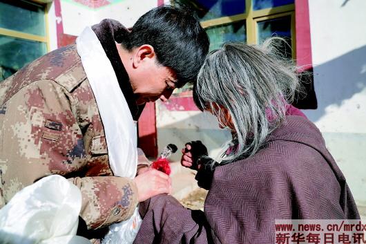 2018年春節(jié)期間,鄒凌(左)在海拔4000多米的玉樹地震災區(qū)甘達村看望79歲的藏族老人尕旦增。受訪者供圖