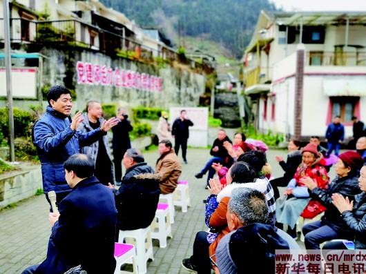3月5日,作為漁子溪村第一書記的鄒凌(左一揮手者)正在給村民開動員大會。記者江毅攝