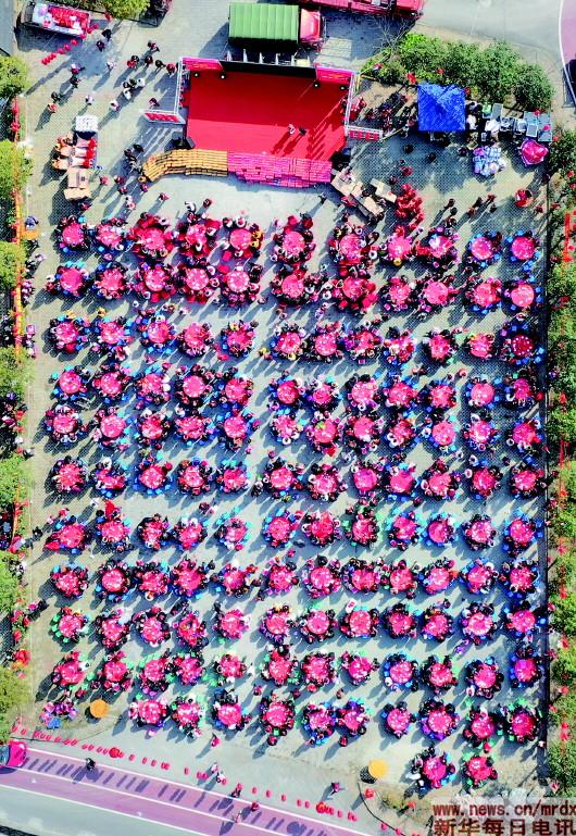 2019年春節(jié)期間,鄒凌團隊在汶川地震震中的映秀鎮(zhèn)漁子溪村舉行“壩壩宴”,十余年來,鄒凌和團隊成員堅持每年春節(jié)都在漁子溪村度過,通過舉辦春節(jié)晚會、“壩壩宴”等形式,鼓舞人心,幫助群眾走出災難陰影。受訪者供圖?
