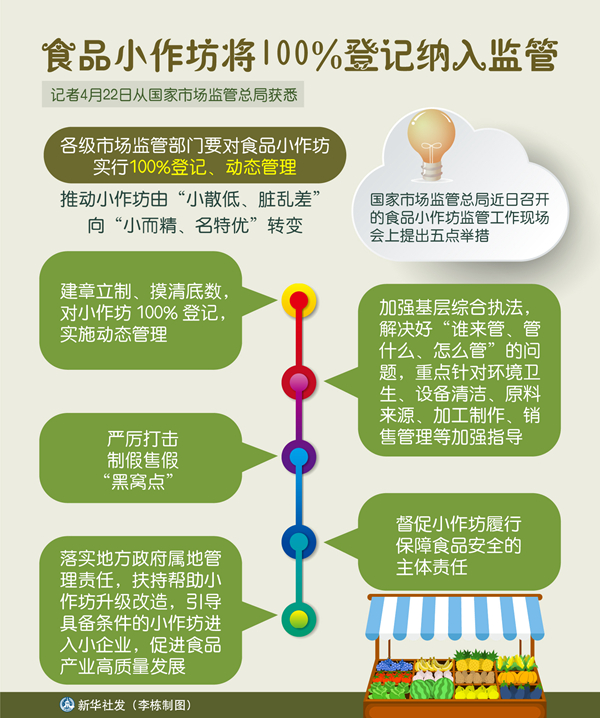 新華社北京4月22日電(記者趙文君)記者22日從國家市場監(jiān)管總局獲悉,各級(jí)市場監(jiān)管部門要對(duì)食品小作坊實(shí)行100%登記、動(dòng)態(tài)管理,推動(dòng)小作坊由“小散低、臟亂差”向“小而精、名特優(yōu)”轉(zhuǎn)變。