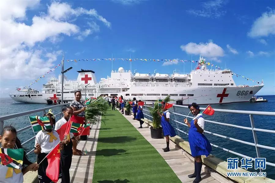 2018年10月12日,在多米尼克首都羅索,當?shù)貙W生揮動多中兩國國旗歡迎中國海軍和平方舟醫(yī)院船首次到訪。新華社發(fā)(江山 攝)