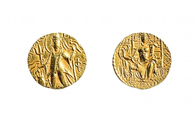 貴霜帝國(guó)伽膩色迦三世金幣 貴霜帝國(guó)伽膩色迦三世時(shí)期(約公元250—270年)鑄造,重7.9克、直徑21.5毫米 中國(guó)錢幣博物館藏