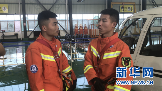 圖為消防員(左唐運德,右李金地)進(jìn)行演練后經(jīng)驗交流。新華網(wǎng) 黃浩 攝