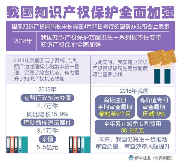 新華社北京4月28日電(記者張泉)國家知識產(chǎn)權(quán)局局長申長雨在28日舉行的國新辦發(fā)布會上表示,2018年,我國知識產(chǎn)權(quán)保護方面發(fā)生一系列根本性變革,知識產(chǎn)權(quán)保護全面加強。