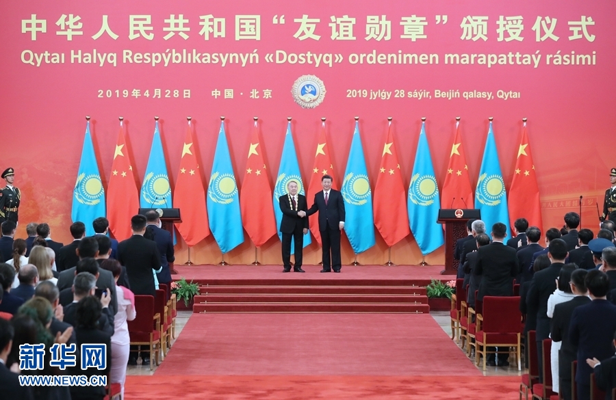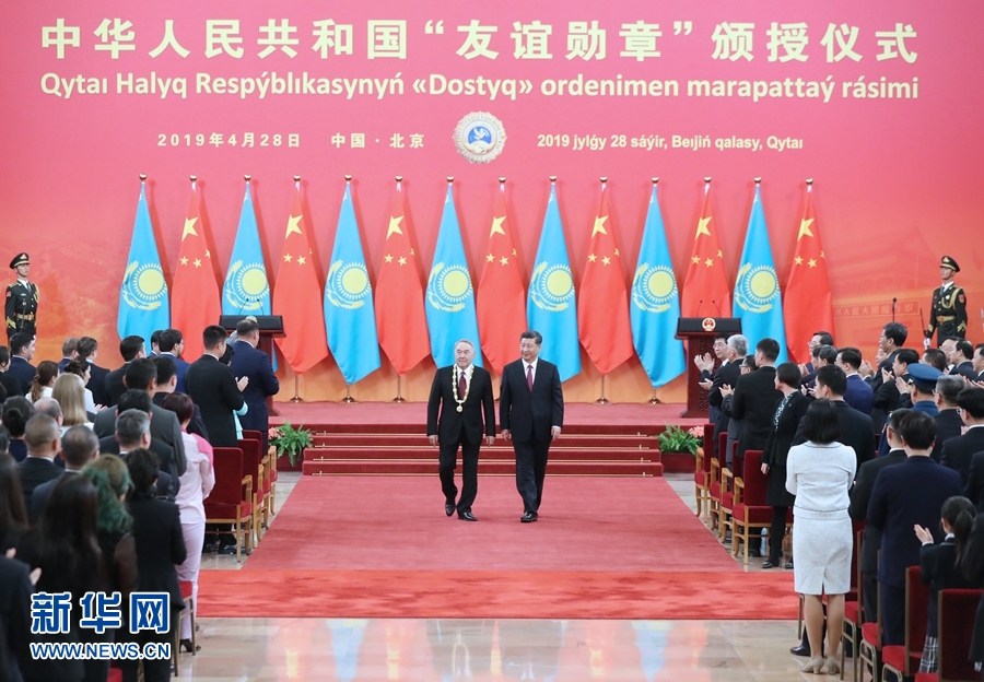 4月28日,國家主席習(xí)近平在北京人民大會(huì)堂中央大廳為哈薩克斯坦首任總統(tǒng)納扎爾巴耶夫舉行“友誼勛章”頒授儀式。新華社記者 鞠鵬 攝