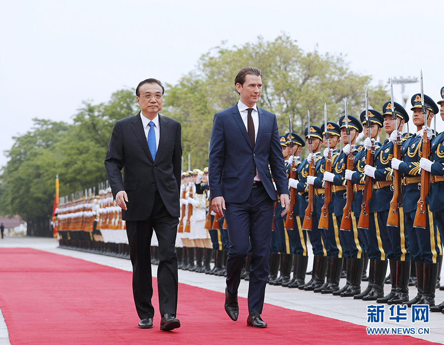 4月28日,國(guó)務(wù)院總理李克強(qiáng)在北京人民大會(huì)堂同奧地利總理庫(kù)爾茨舉行會(huì)談。這是會(huì)談前,李克強(qiáng)在人民大會(huì)堂東門外廣場(chǎng)為庫(kù)爾茨舉行歡迎儀式。新華社記者 劉彬 攝