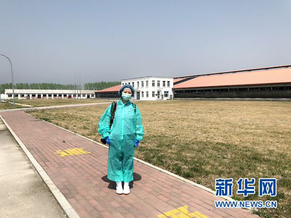 圖為記者穿戴消毒衛(wèi)生裝備進入良種場采訪。 新華網(wǎng)馮文雅/攝