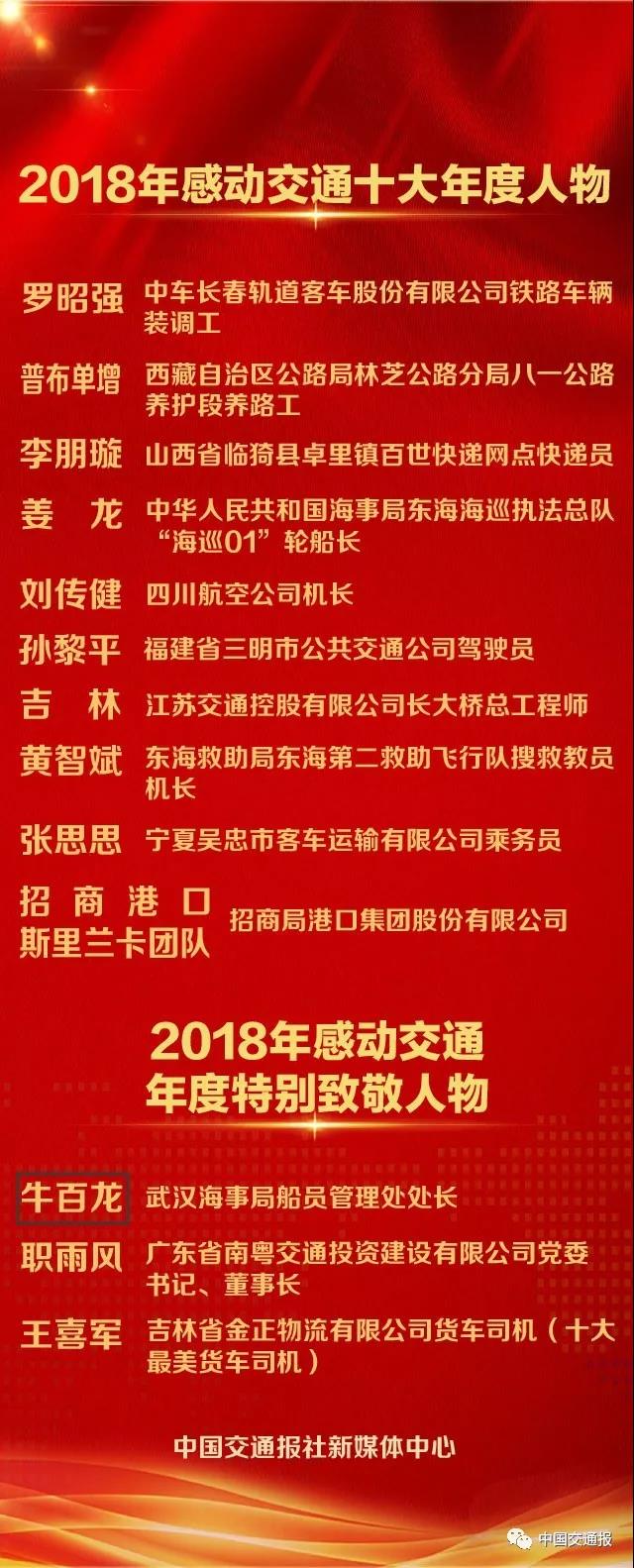 另外,將青春和生命奉獻(xiàn)給海事交通事業(yè)的武漢海事局船員管理處處長牛百龍;胸懷大愛,積極踐行“大道為公”理念的廣東南粵交通投資建設(shè)有限公司黨委書記、董事長職雨風(fēng);400萬公里安全駕駛、細(xì)心工作、熱心助人的吉林省物流貨車司機(jī)王喜軍榮獲“2018年感動(dòng)交通年度特別致敬人物”稱號(hào)。