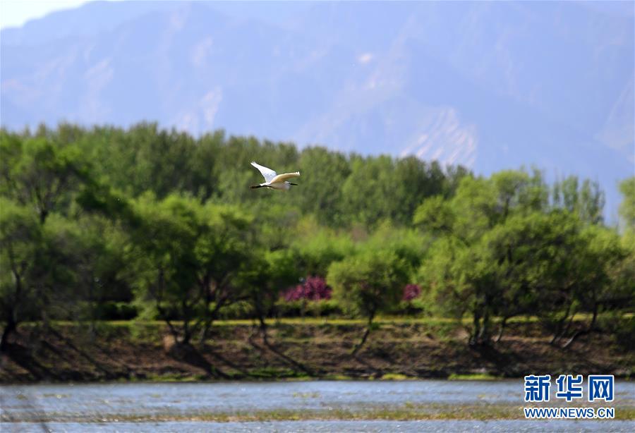 2019年4月30日,水鳥在媯水河畔的自然生態(tài)展示區(qū)飛翔。 新華社記者 張晨霖 攝