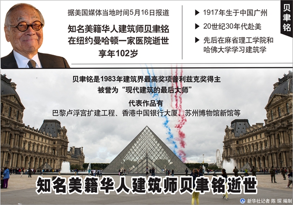 新華社紐約5月16日電(記者長遠(yuǎn) 潘麗君)據(jù)美國媒體16日報道,知名美籍華人建筑師貝聿銘在紐約曼哈頓一家醫(yī)院逝世,享年102歲。