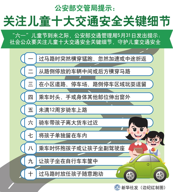 新華社北京5月31日電(記者王茜)兒童的交通危險認(rèn)知、自我保護能力不強,容易受到交通意外的傷害?!傲弧眱和?jié)到來之際,公安部交通管理局31日發(fā)出提示:社會公眾要關(guān)注兒童十大交通安全關(guān)鍵細(xì)節(jié),守護兒童交通安全。