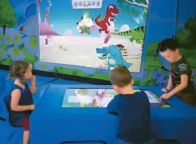 陸浩川團(tuán)隊(duì)的人機(jī)交互產(chǎn)品如今已銷往全球20多個(gè)國家。圖為兒童正在交互屏幕前玩得不亦樂乎。(受訪者供圖)