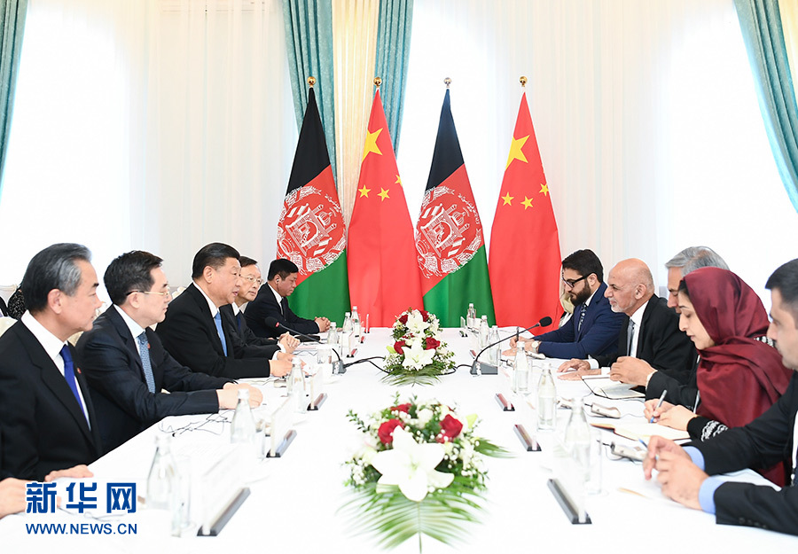 6月13日,國家主席習(xí)近平在比什凱克會(huì)見阿富汗總統(tǒng)加尼。 新華社記者 謝環(huán)馳 攝