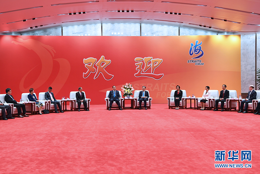 6月16日,中共中央政治局常委、全國(guó)政協(xié)主席汪洋在廈門出席第十一屆海峽論壇并致辭。這是論壇開幕前,汪洋會(huì)見(jiàn)出席論壇的部分兩岸嘉賓和主辦單位代表。 新華社記者 饒愛(ài)民 攝