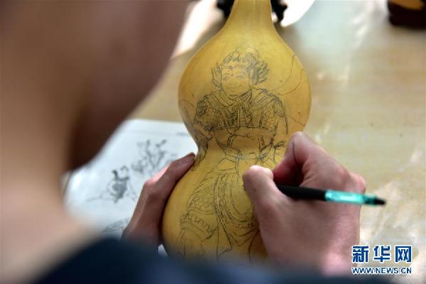 午后陽(yáng)光和煦,聽(tīng)障生創(chuàng)新創(chuàng)業(yè)工作室里,來(lái)自貴州的徐崇瑞手持鉛筆,在一個(gè)嶄新的葫蘆上勾勒年畫,筆法細(xì)膩,有條不紊。身后的書架上整齊擺放著他們制作的葫蘆烙畫、手工皮包、糧食鑲嵌畫等作品。