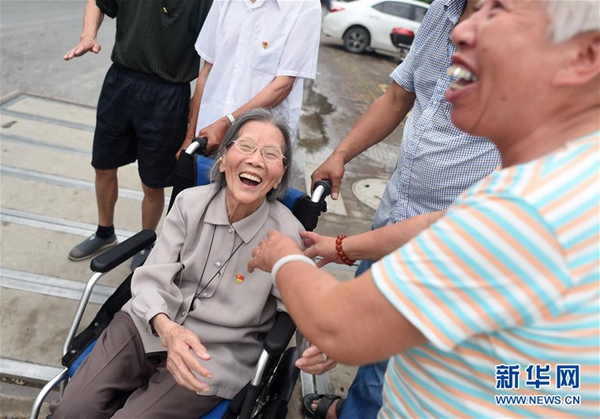 7月1日,呂銀芬(前右)來到七一村黨群服務中心參加“七一”主題黨日活動。新華社記者 韓傳號 攝