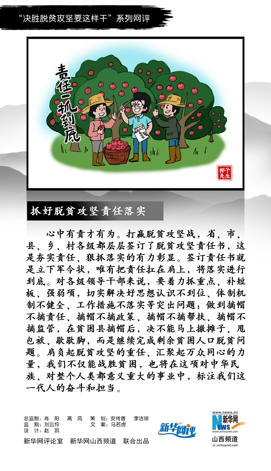 心中有責(zé)才有為。打贏脫貧攻堅(jiān)戰(zhàn),省、市、縣、鄉(xiāng)、村各級(jí)都層層簽訂了脫貧攻堅(jiān)責(zé)任書,這是夯實(shí)責(zé)任、狠抓落實(shí)的有力彰顯。簽訂責(zé)任書就是立下軍令狀,唯有把責(zé)任扛在肩上,將落實(shí)進(jìn)行到底。對(duì)各級(jí)領(lǐng)導(dǎo)干部來(lái)說(shuō),要著力抓重點(diǎn)、補(bǔ)短板、強(qiáng)弱項(xiàng),切實(shí)解決好思想認(rèn)識(shí)不到位、體制機(jī)制不健全、工作措施不落實(shí)等突出問(wèn)題;做到摘帽不摘責(zé)任、摘帽不摘政策、摘帽不摘幫扶、摘帽不摘監(jiān)管,在貧困縣摘帽后,決不能馬上撤攤子、甩包袱、歇歇腳,而是繼續(xù)完成剩余貧困人口脫貧問(wèn)題。肩負(fù)起脫貧攻堅(jiān)的重任、匯聚起萬(wàn)眾同心的力量,我們不僅能戰(zhàn)勝貧困,也將在這項(xiàng)對(duì)中華民族、對(duì)整個(gè)人類都意義重大的事業(yè)中,標(biāo)注我們這一代人的奮斗和擔(dān)當(dāng)。(馬若虎)