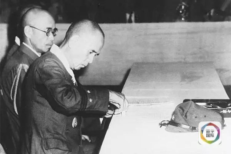 這是侵華日軍總司令岡村寧次等在南京簽蓋降書。岡村寧次還向中方交出他的隨身佩刀,以表示侵華日軍正式向中國(guó)繳械投降。