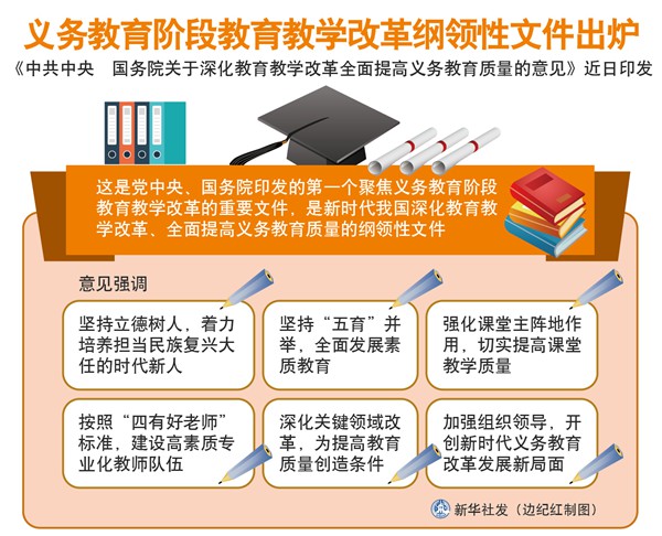 新華社北京7月8日電(記者胡浩)《中共中央 國務(wù)院關(guān)于深化教育教學(xué)改革全面提高義務(wù)教育質(zhì)量的意見》近日印發(fā)。這是黨中央、國務(wù)院印發(fā)的第一個(gè)聚焦義務(wù)教育階段教育教學(xué)改革的重要文件,是新時(shí)代我國深化教育教學(xué)改革、全面提高義務(wù)教育質(zhì)量的綱領(lǐng)性文件。
